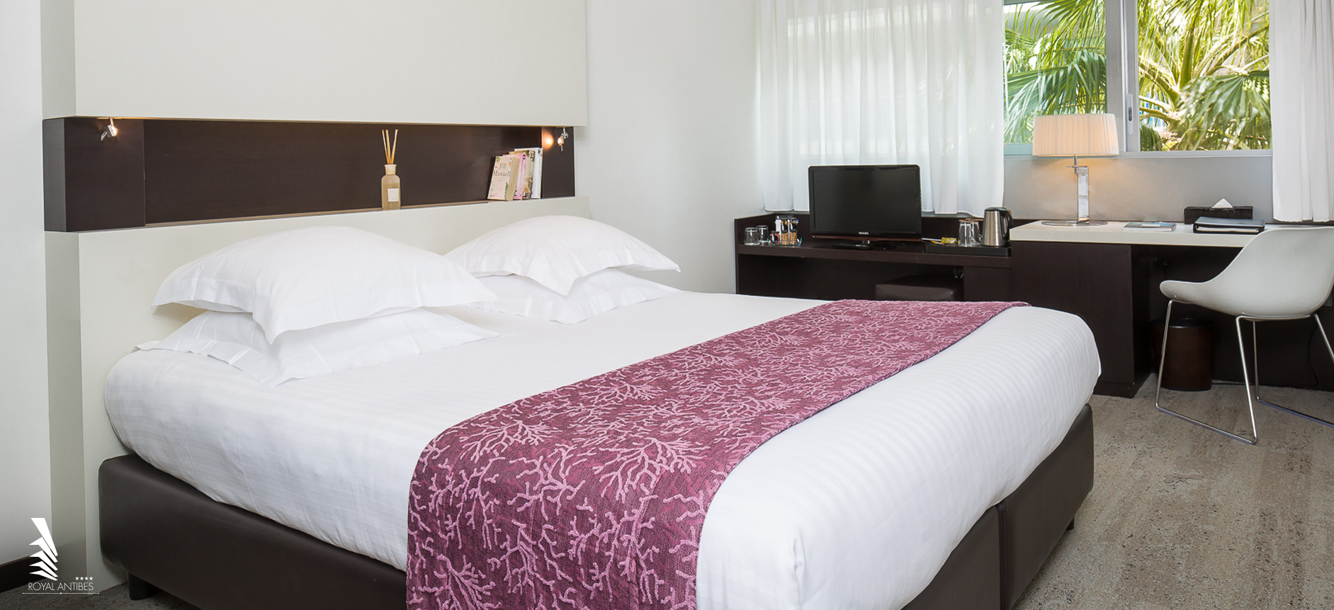 Las habitaciones SUPÉRIEURE están situadas en la parte trasera del ROYAL ANTIBES y dominan la avenida Général Maizière. Son más espaciosas que las Classique, ofrecen 25 m². Pueden acoger una cama suplementaria, por lo que son ideales para tres viajeros. En ellas encontrará un ambiente contemporáneo decorado con un mobiliario de líneas depuradas que recuerda el estilo de una cabina de barco. Un conjunto de diseño muy seductor. El cuarto de baño está dotado de una bañera o una gran ducha italiana.